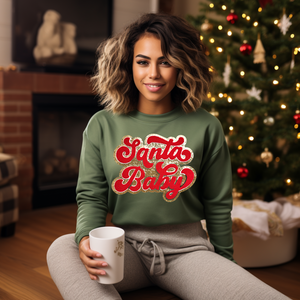 Introducing our Pink Santa Baby Chenille Patch Sweatshirt – the perfect blend of style and coziness to embrace the holiday season with flair!